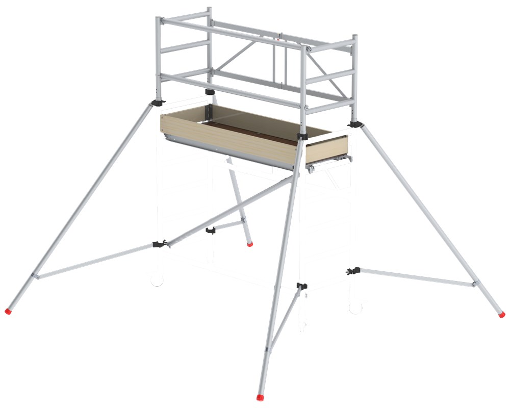 De vouwsteiger heeft een vouwdeel in het frame en is daardoor eenvoudig op te zetten. Na demontage neemt de steiger weinig opbergruimte in.